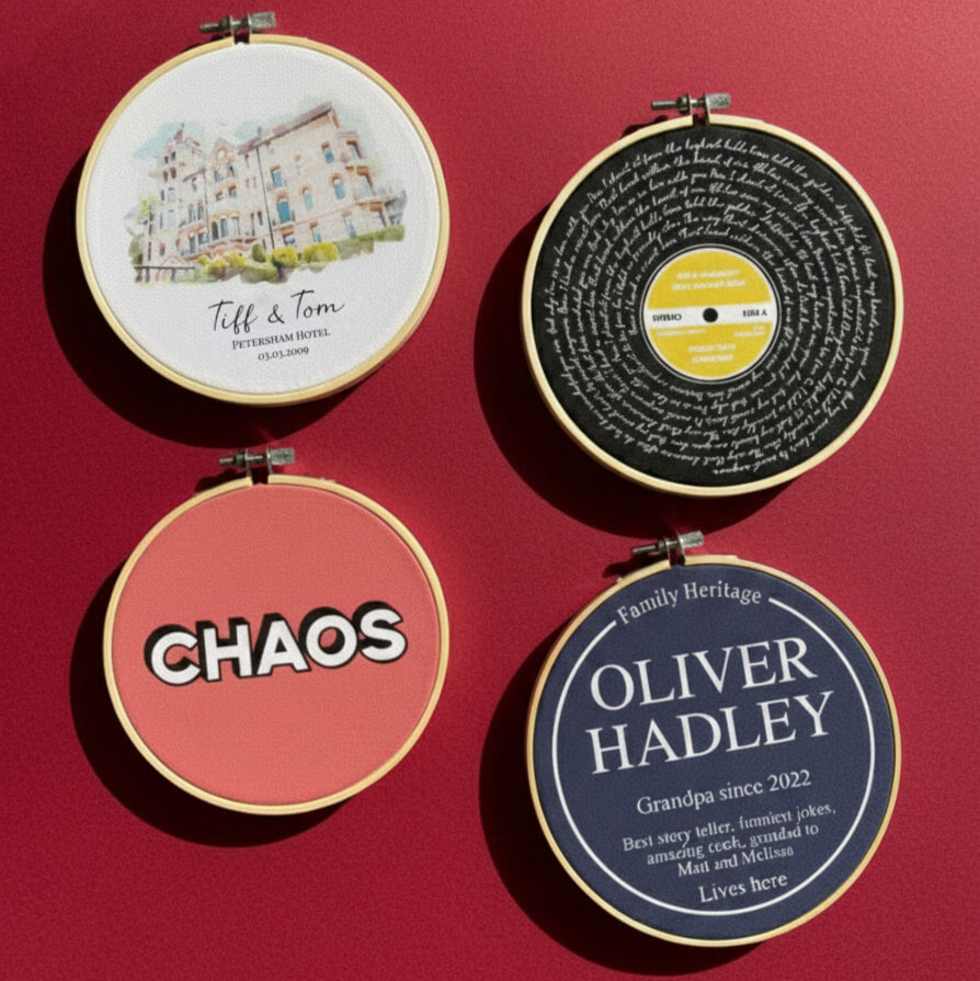 Our circular frames are are made of bamboo wood which is a more eco-friendly than traditional wood due to it being much faster growing. The print design is then printed directly onto cotton canvas and then placed within the circular frame to form a unique wall decor.