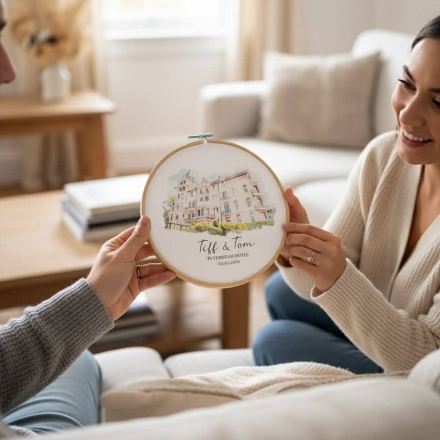 The most popular ways to display this are to either rest it on a shelf or thread a ribbon through and hang on the wall.